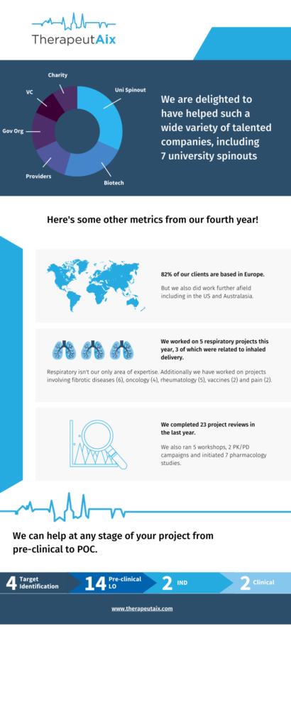 Last year, we extended the TherapeutAix workshop format with a new offering, a crowd-funded solution with a consortium of companies. This complements our existing workshop solutions to address the specific needs of an individual client, ranging from data review to strategic discussions.