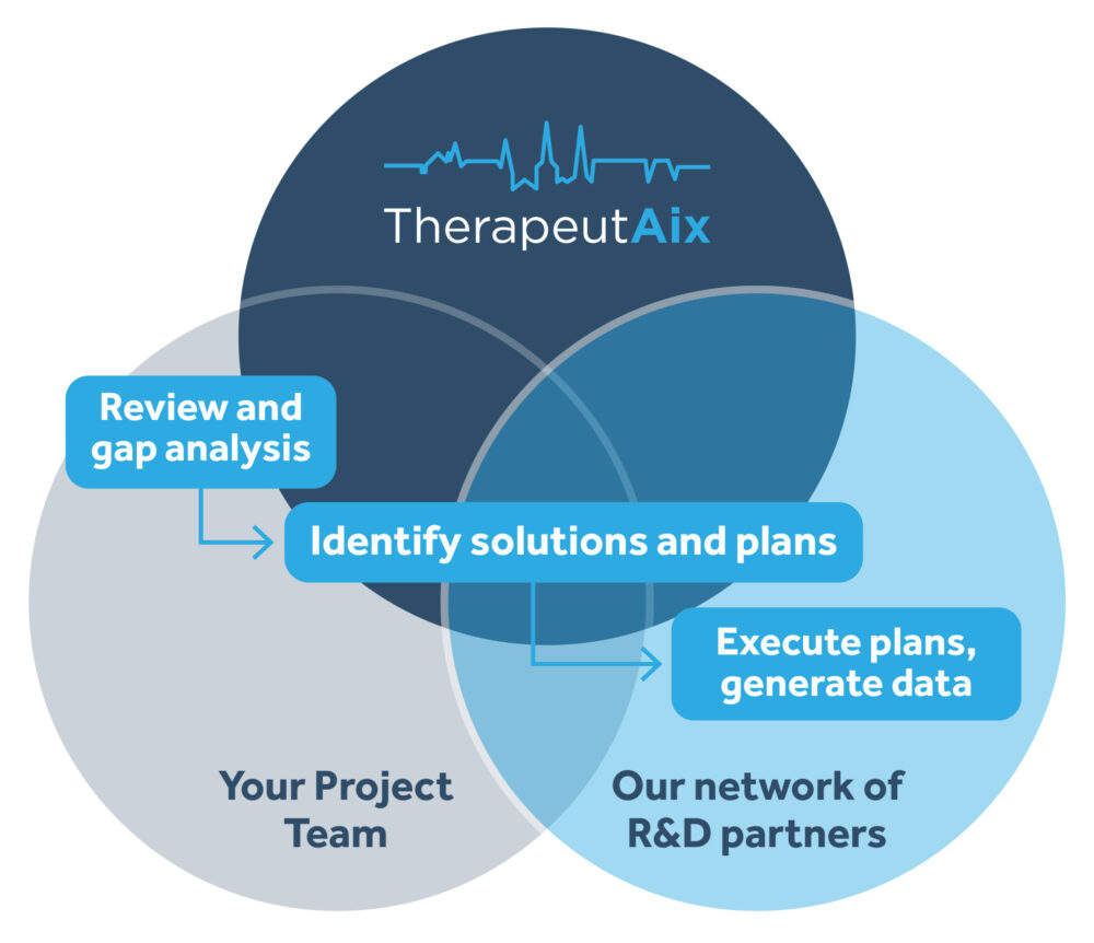The team at TherapeutAix work alongside you, together with or as an extension of your team, providing a science-led collaboration to identify challenges, plan solutions, and obtain supporting data.